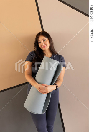 Beautiful plus-size woman in gym clothes holding yoga mat with soft smile and natural pose