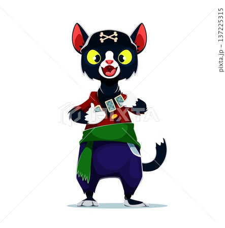 Cartoon black cat pirate vector character holds three playing cards in paws. Corsair wears a black headband with bones and red shirt, green sash, purple trousers. Pirate party personage