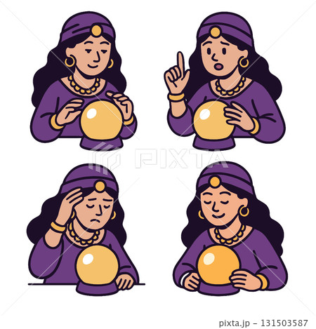Fortune teller woman, crystal ball, purple dress, gold jewelry, four emotional expressions