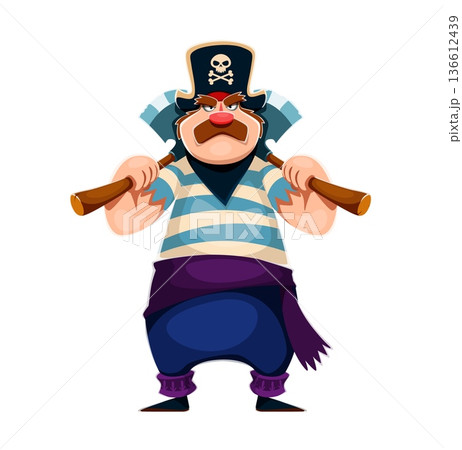 Cartoon pirate warrior character dressed in a striped shirt, blue trousers and purple sash. Corsair carrying two heavy wooden axes on shoulders. Cartoon bandit personage for kids game and birthday
