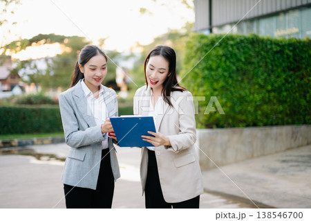 Asian businesswomen discussing work strategy and career planning outdoors, professional teamwork, consulting and communication concept