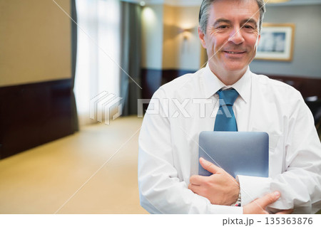 Man in business attire holding tablet in conference corridor with wood paneling, copy space