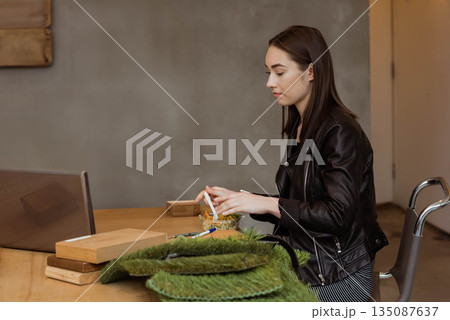 Woman wearing leather jacket sitting at coworking table eating salad near open laptop, copy space