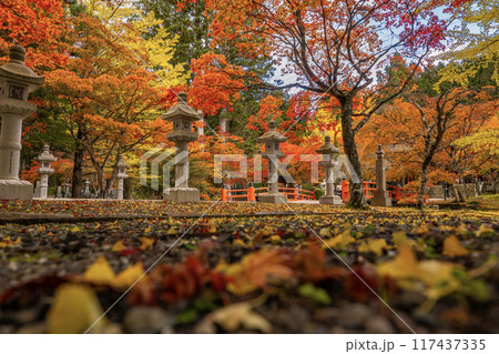 裝飾寺廟的紅色和黃色 高野山的紅葉