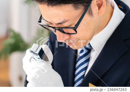 一位中年男性珠寶鑑定師用放大鏡看戒指的圖片
