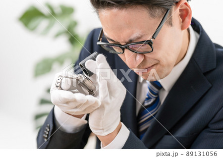 一位身穿日本服裝的男性鑑賞家用放大鏡檢查陶瓷的圖像