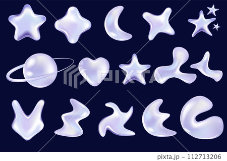 3d holographic stars and planets set in y2k, futuristic style. Holographic hearts in y2k style. Trendy liquid metal elements. Purple glossy abstract shape.