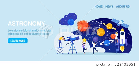Astronomy, astronomical observation. Man studying galaxy through telescope, explore planets, universes. People watching meteors, constellation of stars. Astronomer observing sky with celestial bodies