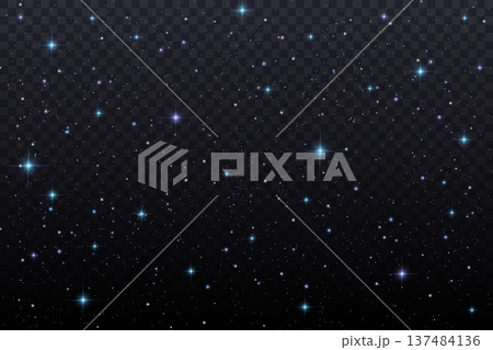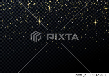 Night sky with stars. Galaxy background with transparent effect. Shiny golden glitter and stellar particles. Christmas magic decoration with twinkles and dreamy sparks. Vector