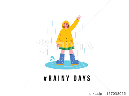 穿著雨衣、拿傘的女孩/雨季/向量手繪線描插畫