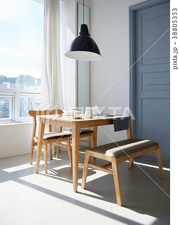 白色空間內配有木製餐桌的室內裝飾