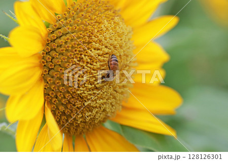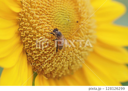 拍攝在向日葵上收集花粉的蜜蜂特寫照片