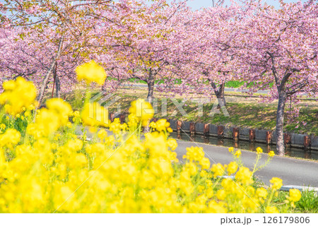 沿河成排的櫻花樹:河津櫻花和油菜花盛開