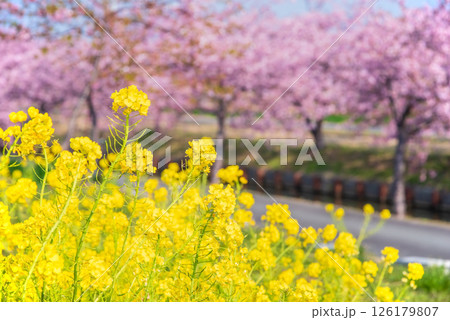 河津櫻花節盛開的河津櫻花和黃色油菜花