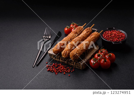 Lula kebab meat fried on a fire in breading with salt, spices and herbs