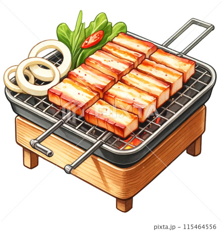 Watercolor illustration of Samgyeopsal (grilled pork belly) on a barbecue grill.