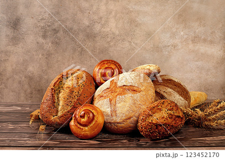 Freshly baked bakery products on wooden background. Whole grain homemade bread, different types of round sourdough bread with crispy crust, baguettes, buns and ears of wheat, modern baking concept,
