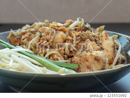 Fried thai noodle (pad thai) mix Stirred fried turnip cake or Fried radish cake (chai tow kway) served with bean sprout and chives in ceramic plate.