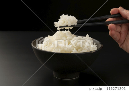 用筷子夾起米飯蒸出的蒸汽