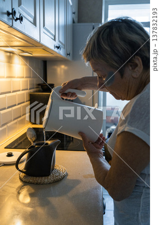 An elderly woman with dark circles under her eyes pours hot water from an electric kettle into teapot in her kitchen, enjoying her morning routine. Real people, life of an elderly person