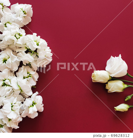 White different flowers are on a dark red background. The basis for the invitation. Product background. Place for the text. Beauty concept. View from above.
