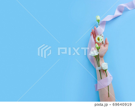 Top view of caucasian female hand, white flowers and silk pink ribbon on a bright blue background. Fashion art and beauty flatlay. Care Concept.