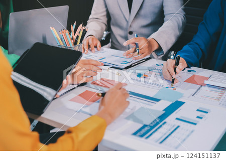 Closeup of team of industrial engineers meeting analyze machinery blueprints consult project on table in manufacturing factory. Working in manufacturing plant or production plant.