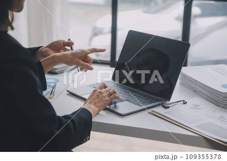 Three young attractive women in business suits are sitting at a desk and discussing workflows. Head