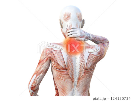 一名女性因頸部僵硬而握住頸部的肌肉解剖圖、上身、後視圖(紅色疼痛圖像)的 3D 插圖