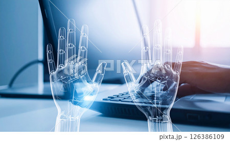 N8n : Transparent robotic hands with visible joints and bones symbolize automation and technology front of person typing laptop keyboard bright