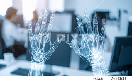 N8n : Transparent ghostlike hands with visible bones over blurred office background showing automation and repetitive computer tasks