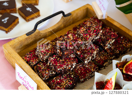 Woman scans cornflakes in grocery store while shopping for breakfast options during weekday