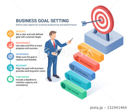 Modern SMART goal setting infographic a businessman targeting objectives ideal for planning, strategy, productivity, and performance presentations.