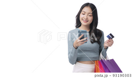 Excited smile Asian woman looking mobile phone holding shopping bag show credit card payment