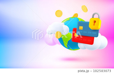 Global payment concept with plastic cards, padlock and the Earth. 3d vector banner with copy space