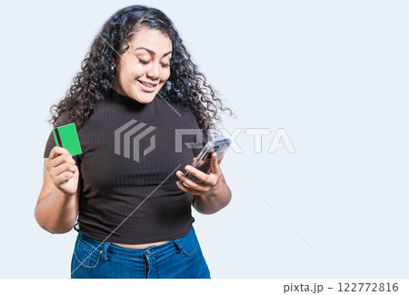 Happy girl holding credit card shopping online with phone isolated. Person making online purchases with cell phone and credit card isolated
