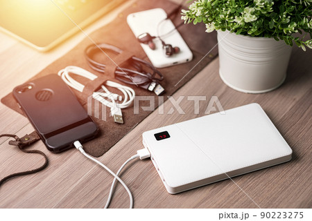 The hand of a young woman holding a smart phone and a modern spare battery charger Place the lap to charge the smartphone with a spare battery charger and play on a chair in room