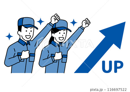 穿著工作服的男女歡騰著升起的箭和拳頭泵