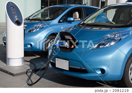Silver electric car parked at biofuel station, eco friendly urban transportation concept