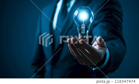 一位商人持有的發光燈泡的特寫鏡頭。產生商業想法的圖像。