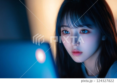 一位女士在藍光照射的房間裡專心致志地使用電腦,享受安靜的時光