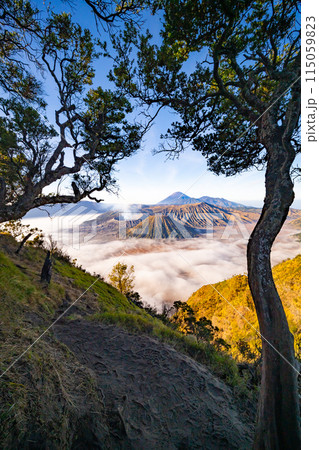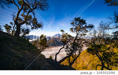 Amazing Mount Bromo volcano during sunny sky from king kong viewpoint on Mountain Penanjakan in Bromo Tengger Semeru National Park,East Java,Indonesia.Nature landscape background