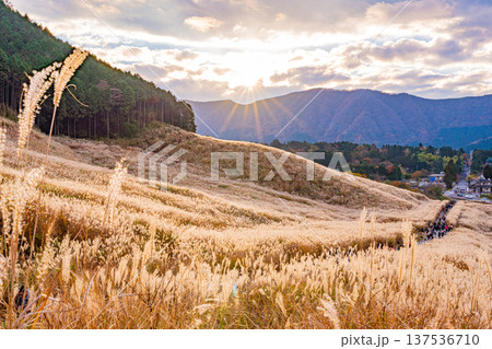 (神奈川縣)夕陽西下,箱根仙石原的金黃色銀草田映照著金色的陽光
