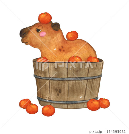 Capybara sits in a barrel with oranges. Watercolor illustration hand drawn cartoon. Drawing for printing on cake, stickers, poster, fabric. Animal, rodent, brown, children, kids