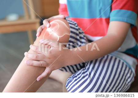 Little boy suffering from knee joint pain with red x-ray bone graphic overlay, child touching leg feeling ache from injury, growing pains, inflammation or accident while playing at home.