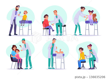 Sick kids with doctor. Child patient, children check up on hospital. Ill little patients, vaccination or pediatrician exam utter vector set