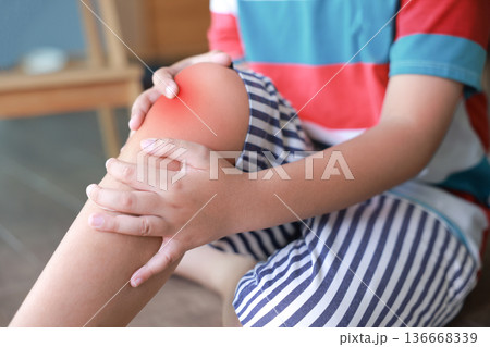 Little boy holding red inflamed knee with hands suffering from joint pain or accidental injury at home. Concept of pediatric healthcare, bone problems in children, and orthopedic medical treatment.