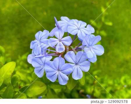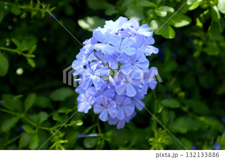藍花茉莉的淡藍色花朵在初夏的陽光下閃閃發光。