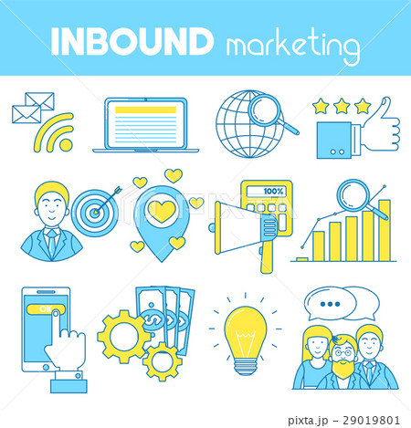 Inbound marketing isometric. Online mass market ads, business target sales ad and offline sale