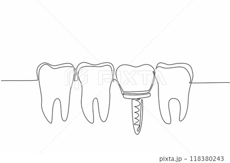 Continuous one line drawing teeth are aligned and one of them is an implant tooth. Do everything to prevent cavities. More caring. World Oral Health Day. Single line draw design vector illustration